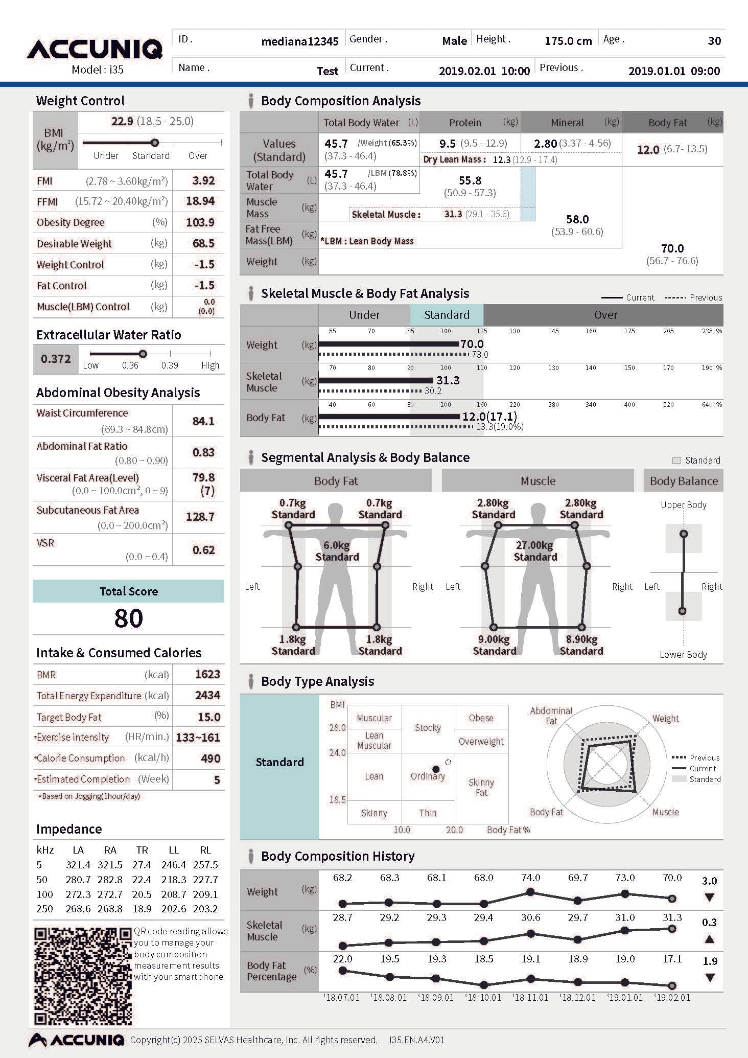 Segmental body composition analysis: Tetra-polar 8 point electrodes system gives accurate measure of segmental body fat and muscle mass.