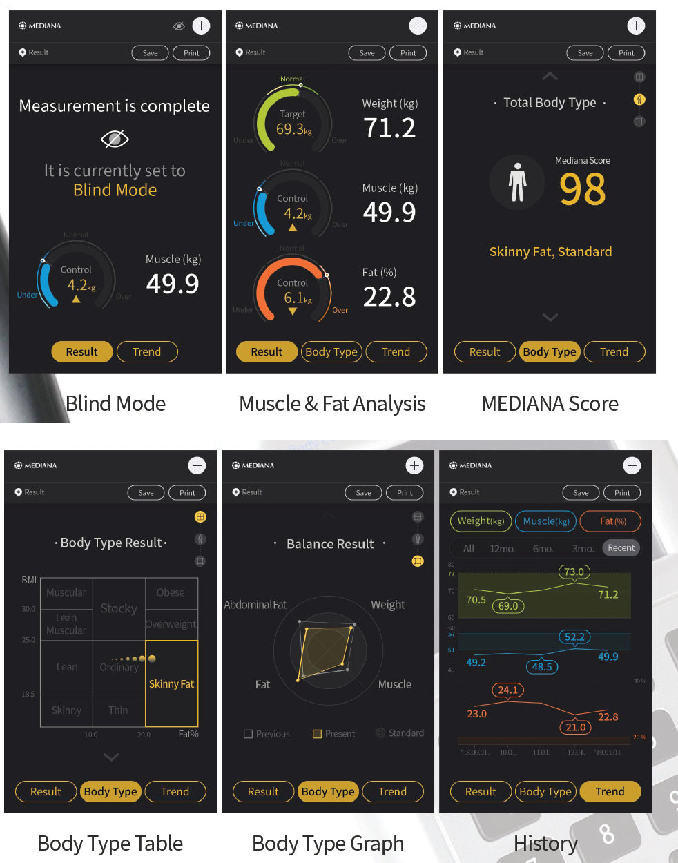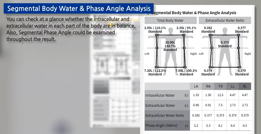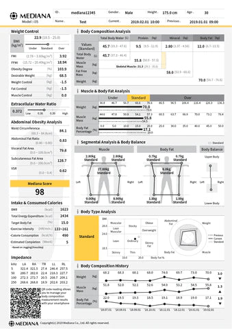 Segmental body composition analysis: Tetra-polar 8 point electrodes system gives accurate measure of segmental body fat and muscle mass.