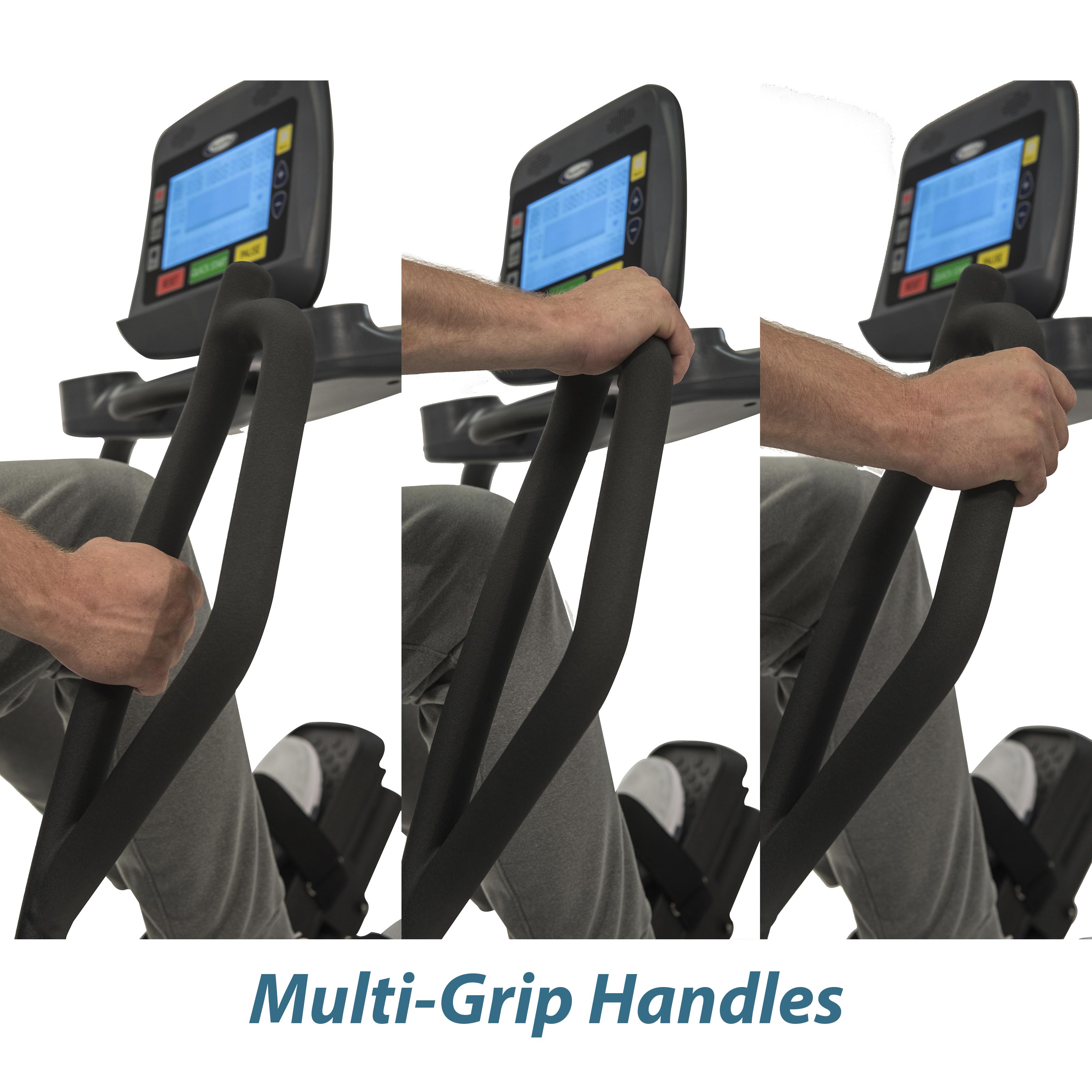Comfortable and fluid seated elliptical pedaling motion with connected arm pushing and pulling motion.